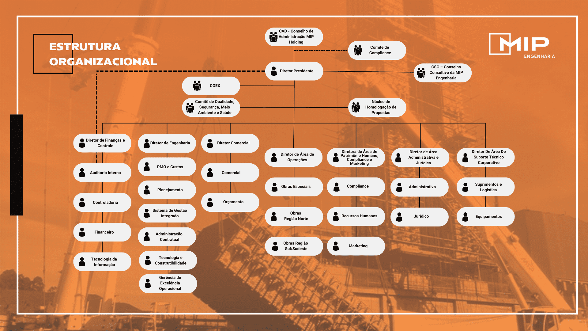 Iomar Tavares da Cunha foi nomeado diretor presidente da MIP Engenharia em abril de 2015. Ingressou na MIP em junho de 1986 iniciando sua trajetória profissional na empresa com o cargo de engenheiro de departamento de obras. Posteriormente passou a ocupar os cargos de engenheiro de campo, engenheiro superintendente de obras e diretor comercial. É graduado em Engenharia Elétrica pela Pontifícia Universidade Católica de Minas Gerais (PUC-MG) e possui MBA em gestão de negócios pela Fundação Dom Cabral (FDC). Participou do PGA (Programa de Gestão Avançada) pela Fundação Dom Cabral (FDC) em parceria com o INSEAD.